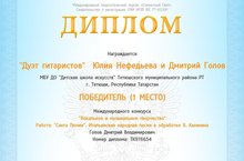 В январе творческие коллективы Детской школы искусств - академический вокальный ансамбль «Золотой Ключ» (рук. Голова В.Ю.) и «Дуэт гитаристов» (Нефедьева Юлия и Голов Д.В.), приняли участие в дистанционном Международном конкурсе «Солнечный свет». Основная цель конкурса - обмен опытом педагогов и воспитанников, развитие и выявление творческого потенциала учителей и учащихся.