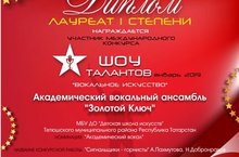 Творческие коллективы Детской школы искусств - академический вокальный ансамбль «Золотой Ключ» (рук. Голова В.Ю.) и ансамбль гитаристов «Скамеечка» (рук. Голов Д.В.) приняли активное участие в Международном онлайн конкурсе «ШОУ ТАЛАНТОВ». Конкурс был направлен на поиск и поддержку талантливых солистов и творческих коллективов, активизация их творческого потенциала; пропаганду и популяризацию вокального, инструментального и хореографического искусства и т.д.