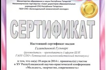 Студентка 23 группы Галятдинова Гульнара приняла участие в XV Республиканской научно-практической конференции «Молодость, творчество, современность», состоявшейся 18 апреля 2014 г.