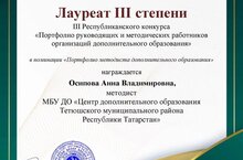Методист по туризму Центра дополнительного образования Осипова Анна Владимировна награждена дипломом Лауреата 3 степени ГБУ ДО «РЦВР» за участие в III Республиканском конкурсе «Портфолио руководящих и методических работников организаций дополнительного образования» в номинации «Портфолио методиста дополнительного образования».