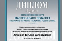 Ахтонова Татьяна Валентиновна, педагог дополнительного образования ЦДО, награждена дипломом лауреата Всероссийского конкурса мастер-класс педагогов «Воспитание патриота и гражданина России 21 века».