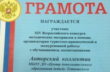 Дипломом участника XIV Всероссийского конкурса методических материалов в помощь организаторам туристско-краеведческой и экскурсионной работы с обучающимися и воспитанниками «За успехи в разработке методических материалов по организации туристско-краеведческой деятельности»