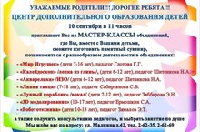 10 сентября Центр дополнительного образования детей собрал всех желающих на День открытых дверей и мастер-классов! В программе этого дня была мастер-классы педагогов по 7 направлениям, интерактивная экскурсия по всем объединениям и знакомство с образовательными программами, реализуемыми в Центре.
