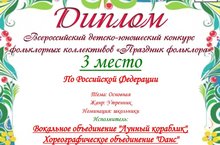 Обучающиеся вокального объединения «Лунный кораблик» (педагог Зяббарова Э.Н.) и хореографического объединения «Данс» (педагог Сергеева Е.М.) стали лауреатами 3 степени Всероссийского конкурса «Праздник фольклора».