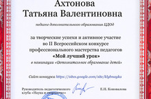 Педагог дополнительного образования МБОУ ДОД «Центр дополнительного образования детей Тетюшского муниципального района РТ» Ахтонова Татьяна Валентиновна, (объединение «Природа в декоративно-прикладном творчестве») награждена благодарственным письмом за творческие успехи II Всероссийского конкурса профессионального мастерства педагогов «Мой лучший урок» в номинации «Дополнительное образование детей».