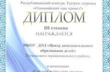 Дипломом 3 степени Министерства образования и науки Республики Татарстан награжден МБОУ ДОД «Центр дополнительного образования детей Тетюшского муниципального района РТ» в Республиканском конкурсе Театров здоровья «Олимпийский наш привет!»