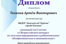 Воспитанник объединения МБУ ДО "ЦДО" "Лего -роботы" Тиханов Артем (педагог Трофимова Н.А.)на базе МБДОУ детский сад "Березка", приняли участие в I Всероссийском конкурсе по лего-конструированию и робототехнике «Изобретательно и занимательно». Конкурс проводился Центром образования "Инициатива" с целью выявления и поддержки одаренных и талантливых детей, а также развития и реализации творческих и конструктивно-модельных способностей.
