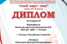Педагог Центра дополнительного образования Никоноров Д.В. награжден Дипломом 2 степени 27 Международного фестиваля-конкурса видеофильмов туристской, краеведческой и природоохранной тематики «Алый парус-2022» имени В.Н. Кочурова в номинации «Визитки студий» категория «Педагоги».