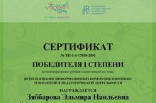 Зяббарова Эльмира Наильевна, заведующая отделом по методической работе Центра дополнительного образования награждена сертификатом победителя 1 степени, за подтверждение уровня компетенций по теме: «Использование информационно-коммуникационных технологий в педагогической деятельности».