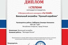Обучающиеся вокального объединения «Лунный кораблик» (педагог Зяббарова Э.Н.),стали победителямиVII Всероссийского конкурса детского творчества «Ты гений!» и награждены Дипломом 1 степени в номинации «Вокальные ансамбли». На конкурс была представлена песня «Молодая Россия».