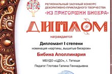 По итогам Регионального заочного конкурса декоративно-прикладного творчества «Из пригоршни бисера», посвящённого 100-летию образования ТАССР, обучающаяся объединения «Мир игрушек»БибинаАполлинария (педагог Глотова Г.Г.) МБУ ДО «Центр дополнительного образования Тетюшского муниципального района РТ стала Дипломантом I степени. Целями и задачами данного конкурса явились формирование интереса у обучающихся к декоративно –прикладному искусству, к культурным ценностям, а также выявление и поддержка одарённых детей. Поздравляем юную участницу конкурса с победой и желаем ей дальнейших творческих успехов!