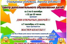 Уважаемые родители, дорогие ребята! Со 2 по 8 сентября Центр дополнительного образования приглашает всех желающих на Дни открытых дверей!