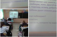 В 4 Б классе прошёл классный час на тему: «Добро и зло» В ходе занятия были раскрыты определения добра и зла, обсуждались нормы поведения. Трудным было для детей первый раз взглянуть на себя со стороны и поставить на чашу весов хорошее и плохое. Читая притчу, представилась возможность распознать в себе волка, которого они выкормили.