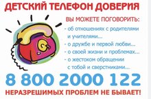 В любой момент нашей жизни может потребоваться психологическая помощь. Дети и их родители могут позвонить на бесплатный круглосуточный телефон доверия 8-800-2000-122. По этому телефону можно получить консультацию, совет как поступить в той или иной ситуации при возникающем конфликте в семье, между сверстниками, проблеме родителей и детей. На звонки отвечают опытные психологи, прошедшие специализированное обучение.
