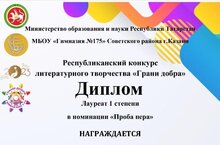 Подведены итоги Республиканского конкурса литературного творчества «Грани добра». Цель конкурса: Популяризация среди обучающихся образовательных организаций Республики Татарстан татарской, русской литературы, повышение интереса к чтению и творчеству, развитие культуры публичного выступления, выявление литературно одаренных обучающихся. В конкурсе приняли участие более тысячи обучающихся Республики Татарстан. Ромашкина В., обучающаяся 7 класса, вошла в число победителей Республиканского конкурса «Грани добра» в номинации «Проба пера» (наставник Гисматуллина С.М.). Поздравляем, желаем дальнейших побед!