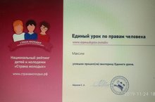 Согласно письму МО и Н РТ №А-9237/19-1 от 12.11.2019 обучающиеся 8-9 классов проходят регистрацию и анкетирование на сайте Единый урок РФ. Мероприятие проходит в рамках Дня прав человека, который отмечается 10 декабря. Мероприятие, направленно на формирование правовой культуры обучающихся. Обучающимся приходят в личные кабинеты сертификаты участников. (учитель истории Чернова Е.В.)