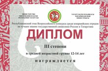 Деревенский Д. обучающийся 8 класса МБОУ "Тетюшская СОШ №1 им.Ханжина П.С." (руководитель Чернова Е.В.) получил диплом 3 степени и стал призером Республиканского этапа Всероссийского конкурса среди юнармейских отрядов на лучшее знание государственной символики России и Татарстана в номинации "Государственная символика Республики Татарстан". -