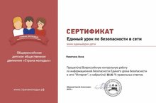 В рамках Всероссийской акции “Безопасность в сети интернет” в школе были проведены ряд мероприятий. Учителем информатики Владимировой О.В. был проведён «Единый урок безопасности в сети Интернет» с показом презентаций и видеороликов с сайта «Сетевичок», «Дети России онлайн». В конце урока была проведена дискуссия по теме урока. Обучающиеся создали буклеты, памятки по безопасному поведению в Интернете, написали Всероссийскую контрольную работу по информационной безопасности и получили сертификаты.