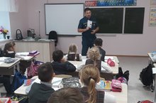 Сегодня во 2 А классе прошел классный час по безопасности в лесу. Провел беседу спасатель - кинолог ЗПСО N 1 Г.Буинска при МЧС РТ Борисов О.Е.