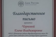 Благодарственным письмом ЦБ РФ по Республике Татарстан награждена Чернова Е.В. за участие в конкурсе педагогического мастерства «Лучший урок по финансовой грамотности» среди педагогов образовательных учреждений и авторскую методическую разработку, направленную на развитие финансового образования.