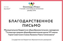 Учащиеся 5 А и 5 В классов прошли обучение по математике (учитель – Россеева Е.В.) в интерактивной форме на онлайн-платформе Учи.ру. С 23 по 29 января 2017 г. приняли участие в основном туре олимпиады по математике «Плюс». Дипломами победителей награждены: Валеева К. (5 А класс), Богян М. (5 А класс). -