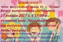 Вечер выпускников состоится 27 января 2017 года в 17:00ч. в актовом зале. Приглашаются все выпускники, независимо от даты выпуска.