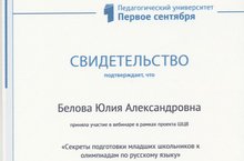 Учитель начальных классов Ю.А. Белова приняла участие в вебинаре в рамках Школы цифрового века и Фонда "Педагогический университет "Первое сентября" на тему: "Секреты подготовки младших школьников к олимпиадам по русскому языку". Вебинар был интересным и познавательным.
