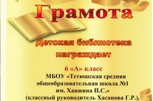 В течение месяца апреля проводился конкурс «Самый читающий класс». После подведения итогов 6А класс (классный руководитель Хасанова Г.Р.) оказался самым читающим и был награждён дипломом победителя.