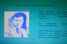 Татар әдәбияты дәресендә 8Б сыйныфы укучылары ( укытучы Исмәгыйлева Г.И.) “Моабит дәфтәре” китабы буенча Җәлилнең тоткынлыктагы иҗаты турында фикер алыштылар. Рус милләтеннән булган укучылар шигырьләрнең тематикасы турындагы мәгълүматны бер-берләренә җиткерделәр. Шагыйрь әйтергә теләгән фикерләрне шигырь юллары белән дәлилләргә тырыштылар, капма-каршы куеп бирелгән чагыштыруларны күзәттеләр.