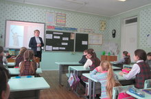 В 4 В классе (кл. рук. Семенычева Г.Д.) был проведен классный час на тему "Патриотизм", где учащиеся 8 В класса (кл. рук. Копушова Т.В.) подготовили обширный материал по данной теме. Ученики 8 В класса познакомили детей с патриотами России, которые являются примером для всех людей и на которых стоит равняться и брать пример.