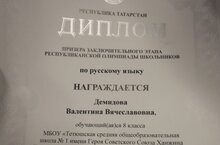 Учащиеся нашей школы Демидова В. и Ризаева Р. (рук.Гасимова С.И.) приняли участие в заключительном этапе республиканской олимпиады школьников по русскому языку. По итогам олимпиады Демидова В. признана призёром! Поздравляем девочку и её наставника!