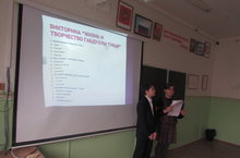 5А сыйныфы укучылары Федорова Арина һәм Адайкин Андрей (укытучылары Хәсәнова Г.Р.)әдәби уку дәресендә Г.Тукай иҗаты буенча викторина үткәрделәр. Сорауларга җавап әзерләү, кроссвордлар чишү укучыларны коллективта эшләргә этәрде. Дәрес бик кызыклы, мавыктыргыч үтте.