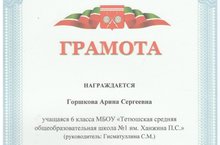 Учащиеся 6В класса Горшкова Арина (рук. Гисматуллина С.М.), 9Б класса Пронина Анастасия (рук. Суркова И.Б) и 9А класса Камбеева Диана (рук. Титова Н.А.) награждены грамотами МКУ «Отдела образования Исполнительного комитета Тетюшского муниципального района РТ» за разработку и участие в муниципальном этапе ХIII республиканской научно-практической конференции школьников имени Л.Н.Толстого.