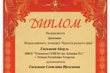 Ученица 4В класса Гасимова Айгуль стала дипломантом Всероссийского конкурса “Красота родного края” (руководитель Гасимова С.И.).