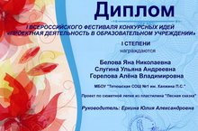 Дипломом I степени I Всероссийского фестиваля конкурсных идей "Проектная деятельность в образовательном учреждении" награждены ученики группы продленного дня: Белова Яна, Слугина Ульяна и Горелова Алена. Руководитель Еркина Ю.А. награждена благодарственным письмом за подготовку победителей.