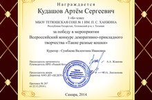 Центр современных дистанционных технологий на интеллектуально- развивающем портале «Рыжий кот» проводил Всесоюзный конкурс декоративно-прикладного творчества «Такие разные кошки», в котором приняли участие ученики 1 Б класса (кл. руководитель Сумбаева В.И.). Молчаев Максим награждён Дипломом участника, а Кудашов Артём Дипломом третьей степени.