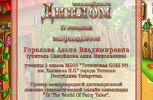 Международная дистанционная лексико-грамматическая онлайн-олимпиада по английскому языку "In The World Of Fairy Tales", проходившая с 1 октября по 30 ноября 2014 года, завершена. В соответствии с положением об олимпиаде результаты прохождения тестирования обработаны и подведены итоги. Призером данной олимпиады, занявшая II место, стала Горелова Алена, ученица 3В класса (учитель по предмету Самойлова А.Н.).
