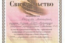 23 Декабря на базе Гимназии №9 Советского района г.Казани прошла Научно-практическая конференция "От рукописной Азбуки к печатной (от Кирилла и Мефодия к Ивану Федоровичу)". С научно-исследовательской работой "А.С.Пушкин и А.А. Ахматова - дети Царского села" выступила Гвоздева Виктория, ученица 9А класса, награждена Свидетельством МО и Н РТ, руководитель Титова Н.А.