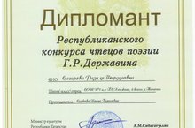 Сагирова Разиля, ученица 6А класса (учитель Суркова И.Б.), Ахмадалиева Алсу, ученица 9В класса (учитель Иванова Ю.Л.) стали дипломантами Республиканского конкурса чтецов поэзии Г.Р.Державина, который проходил в клубе имени Г.Тукая Союза писателей РТ в г.Казани.