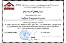 Сертификат участника вебинара получила учитель начальных классов Сумбаева В.И. 16 октября 2014 она приняла участие в вебинаре по вопросам реализации третьего этапа курса ОРКСЭ в соответствии с федеральным стандартом общего образования (ФГОС НОО) в субъектах Российской Федерации организованного ФГАОУ "Академия повышения квалификации и профессиональной переподготовки работников образования".