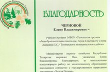 Благодарностью Министерства лесного хозяйства РТ награждена Чернова Е.В. За плодотворную работу по экологическому образованию школьников совместно с государственным природным заказником "Долгая Поляна".