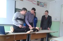 Оказанию первой медицинской помощи при острой сердечной недостаточности обучал учащихся 11 класса на уроке ОБЖ Сурков В.Н., заместитель начальника ТЭС, используя макет- тренажор.