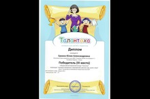 Еркина Ю.А. воспитатель в группе продленного дня заняла II место в V Всероссийском творческом конкурсе "Талантоха" в номинации: "Творческие работы и методические разработки педагогов".