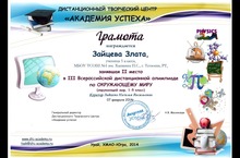 Ученица 5В класса Зайцева Злата приняла участие во Всероссийской дистанционной олимпиаде по окружающему миру, заняла II место. Куратор: Зайцева Н.В.
