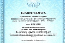 Воспитатель в группе продлённого дня Еркина Ю.А. получила диплом за подготовку ученика 4В класса Пугачёва Сергея, занявшего II место во Всероссийской дистанционной олимпиаде по русскому языку "Грамматическая карусель" для 1-4 классов.