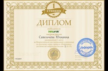 Диплом I степени получила Савельчева Юлиана, ученица 1Б класса (кл.рук. Борисова Е.С.), занявшая I место во Всероссийской дистанционной олимпиаде по русскому языку проекта "Инфоурок".