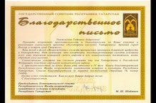 За участие в реализации уникального проекта "Культурное наследие Татарстана: древний город Болгар и остров град Свияжск " педагогический коллектив награждён Благодарственным письмом Государственного Советника Республики Татарстан, М.Ш. Шаймиева.