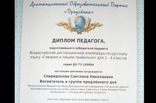Спиридонова Светлана Николаевна, воспитатель ГПД получила Диплом педагога. подготовившего победителя Всероссийской дистанционной олимпиады по русскому языку "Говорим и пишем правильно".