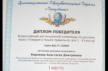 Корнеева Анастасия, ученица 1В класса, воспитанница ГПД (воспитатель Спиридонова С.Н.) заняла I место во Всероссийской дистанционной олимпиаде по русскому языку "Говорим и пишем правильно".
