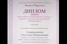 Спиридонова Светлана Николаевна, воспитатель ГПД принимала участие во Всероссийском педагогическом конкурсе разработок внеклассных мероприятий "Новые идеи" и получила диплом лауреата.